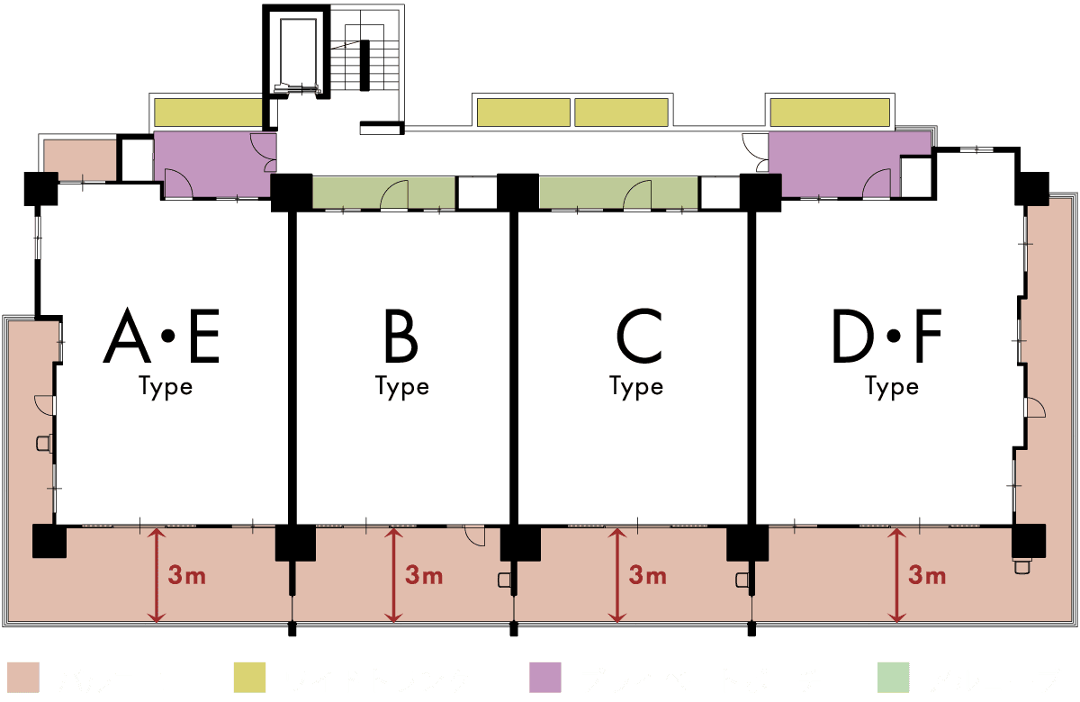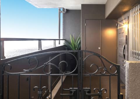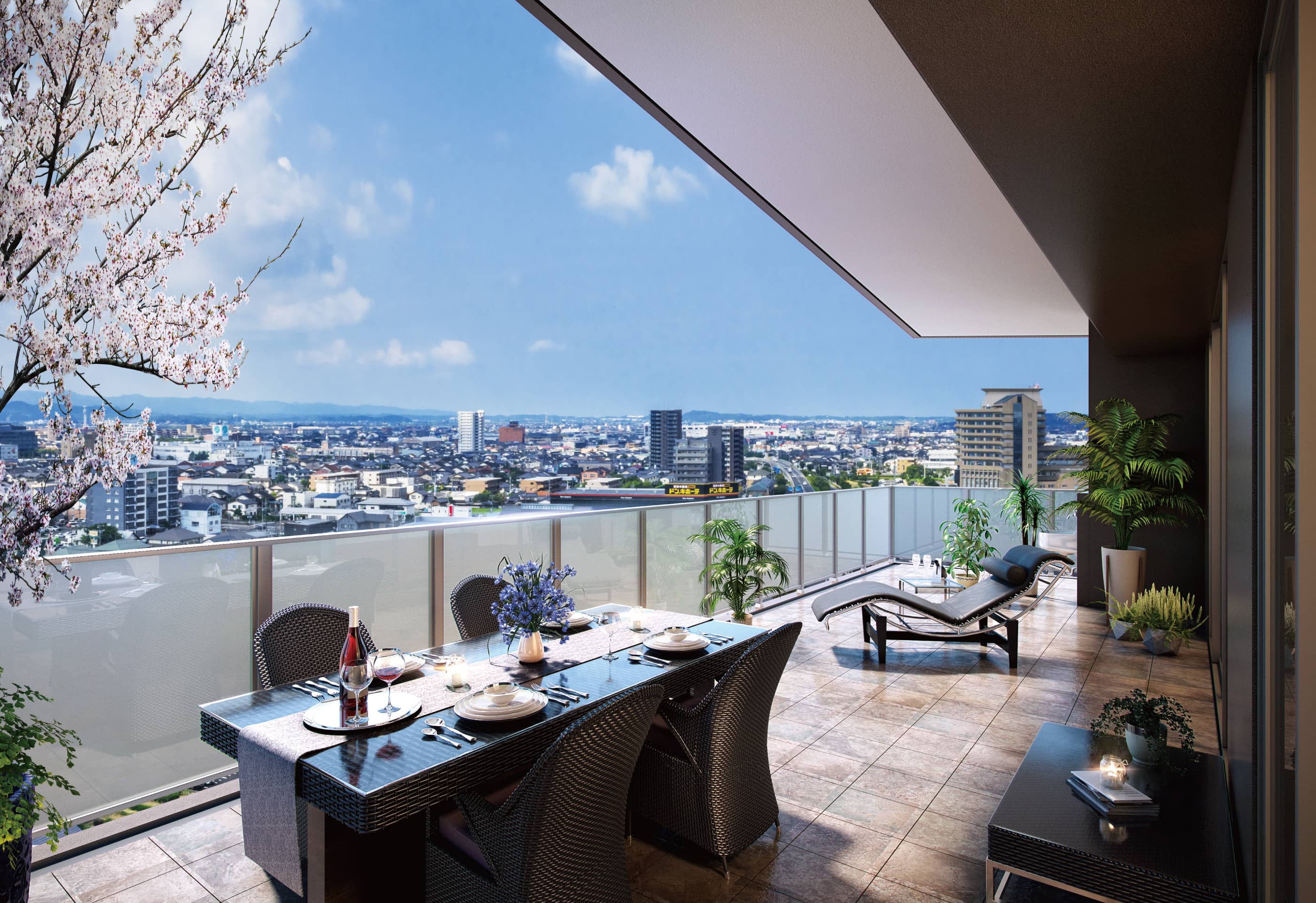全邸南向き・奥⾏3mのワイドバルコニーは、光と⾵、そして眺望を暮らしに取り込む、特等席。出雲神話まつりの花⽕が⽬の前に広がる夏の夜も、市街を⼀望する昼の時間も、そこには⾄福のひとときが流れます。さらに、全邸に備えた⽞関前のワイドトランクや、共⽤部とプライベート空間との緩衝に配慮した設計など──