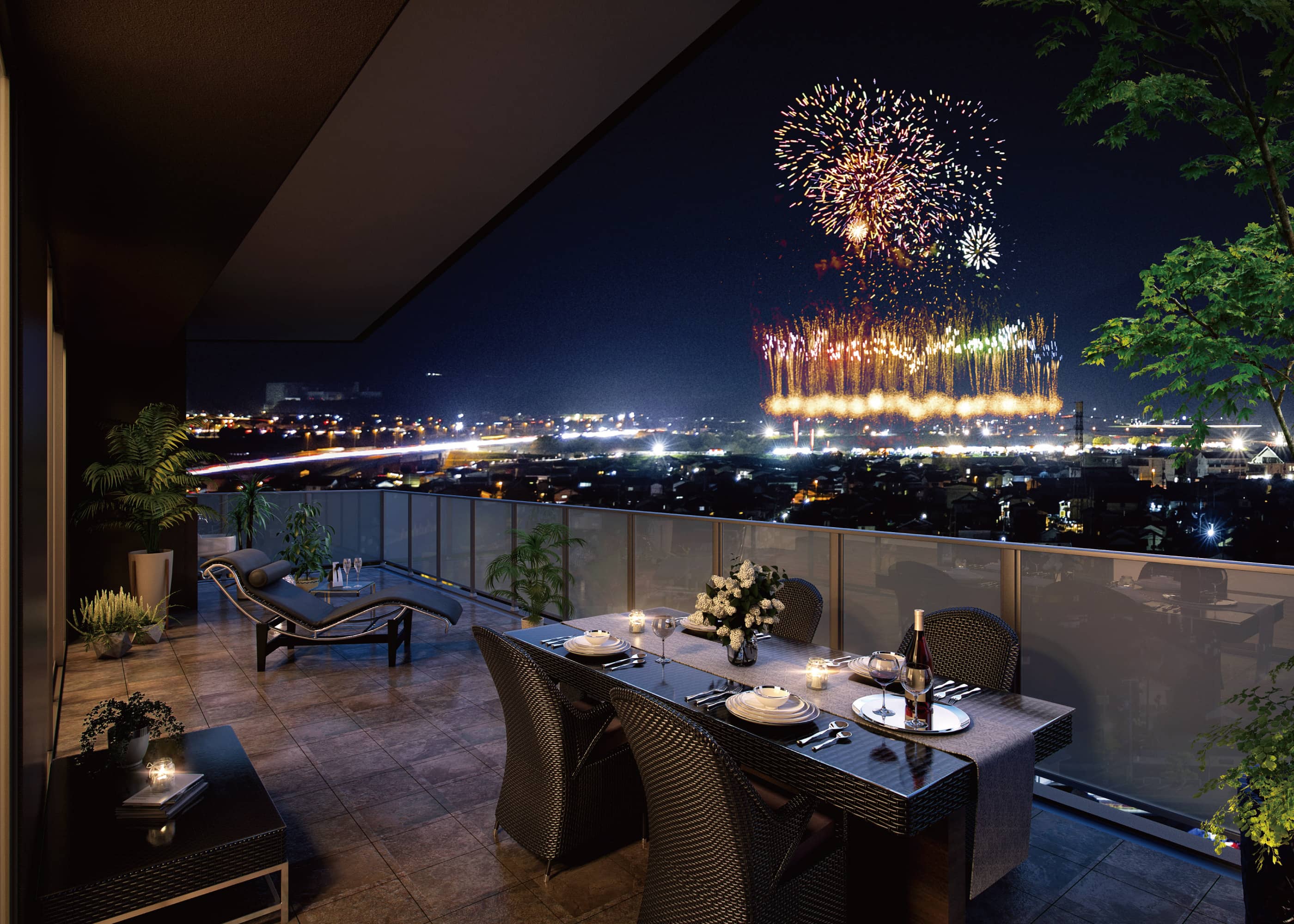 ※バルコニー完成予想図/記載の絵図は図面を基に書き起こし、背景の環境は15階相当の高さでドローン撮影したものと花火を合成したCGイメージです。